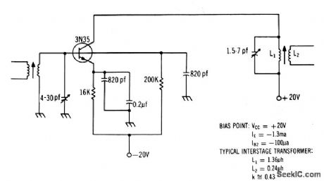 Use of 3N35 gives excellent agc characteristics, Stage gain is 12 db.-Texas Instruments Inc., Solid-State Communications, McGraw-Hill, N,Y., 1966, p 3. (View)