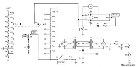 In this circuit, a capacitor is charged to a voltage near its working voltage, as selected by S1. Then S2 is placed in the TEST position, and high-resistance divider R10 to R18 is used to discharge it. The total resistance is 100 MΩ. Taps selected by S1 are used to reduce the voltage seen by the op-amp metering circuit to an appropriate value (around 3V). The discharge curve is watched on the meter. If it is too rapid, the capacitor might be leaky. This technique is useful for values of C that produce a sufficiently large time constant, 10s or more (C>0.1 μF). (View)