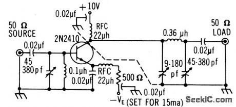 Circuit includes L-section to give generator resistance of 350 ohms from 50-ohm source. Power gain is13 db, noise figure 4 db, and bandwidth 5 Mc.-Texas Instruments Inc., Solid-State Communications, McGraw-Hill, N.Y., 1966, p 309. (View)