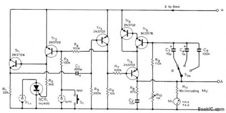 Used in instrument designed to trigger up to five individual flash units at equal increments of time that can rangefrom 11 ms to 11s, as required for such assignments as taking sequence photographs of springboard diver in flight. Transistors Tr1, Tr2, and Tr3 form monostable MVBR that is switched to unstable state by negative pulse applied to base of Tr2 by SCR1 when camera shutter contacts FL1 are closed. Timing circuit Tr4-Tr5-Tr6 provides ramp output at A for feeding voltage-operated switches set to trip at different points of ramp waveform as required for triggering flashes in sequence. Article gives all circuits and setup procedure. Regulated 19.5-V supply is required.-R. Lewis, Multi-Flash Trigger Unit, Wireless World, Nov. 1973, p 529-532. (View)