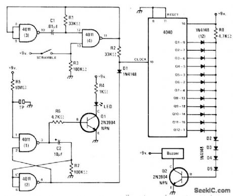 Odds for lottery are set by diode matrix connected to output of 4040 counter. Range is from 1 :2 to 1 : 1024. To use, close scramble switch for a second or two to make free-running oscillator drive counter at high rate, then let contestant hit toueh plate to trigger flip-flop that advances counter one step. If counter was frozen at next to last connected diode, next diode is biased off and Q2 energizes buzzer. For 50-50 odds, connect only diode at output Q1. For odds of 1 in 10, connect diodes only to outputs Q2and Q4 for binary 1010 or 10. With all diodes connected as shown, odds are 1:1024.-J. Sandier, Play 'Random Chance,' Modern Electronics, Oct. 1978, p 42-43 and 88. (View)