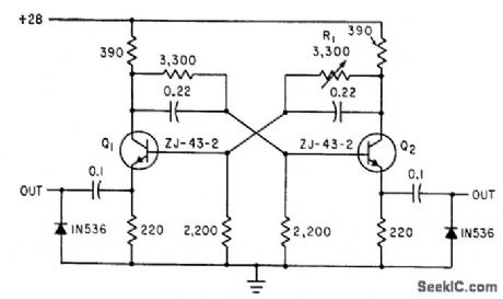 Two outputs from mvbr give alternating trigger pulses to each rectifier. R1 is adjusted for symmetrical operation.-D. V. Jones, Turn-Off Circuits for Controlled Rectifiers, Electronics, 33:32, p 52-55. (View)