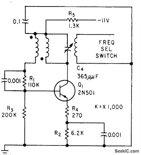 Sine-wave oscillator, tunable over 3:1 frequency range by C4, uses switching transistor. Used in pulse generator for testing high-speed digital computers.-L. Neumann, Transistorized Generator for Pulse Circuit Design, Electronics, 32:14, p 47-49. (View)