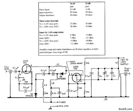 The circuit diagram of the 9-MHz amplifier is given. Note that the AGC amplifier must be capable of sinking the current through D1 at 0 V (i.e., maximum gain). The warning to keep leads short in the drain circuit of the second U310 FET arises from experience in which the initial IP3 measurements proved to be poor because of this stage's oscillating around 400 MHz.Component notes: The two U310s are Siliconix low-noise JFETs. C1 is an 82-pF ceramic, C2 is a 60-pF ceramic trimmer (Cirkit), and all other capacitors are monolithic ceramic (RS components). Resistors are l/8 Wmetalfilm (RS components). D1 and D2 are HP3081 PIN diodes (Farnell). T1 is 1518 turns of 0.224-mm diameter Bicelflux enamel on Fairite Balun core 28-43002402 (Cirkit). T2 (primary) is 2.81 μH, 31 turns of 0.314-mm Bicelflux enamel on Micrometals toroid 737-6 (Cirkit). T2 (secondary) is (1) for 16-dB gain, 3 turns, Rx 6k2; (2) for 13-dB gain, 4 turns, Rx 3k9. Note that (1) and (2) could be relay switched for use with an SSB or CW filter (loss 10 dB or 3 dB). L1, L2, and L3 have 7 turns of 9.314-mm enamel on balun core 28-43002402 (Cirkit). (View)
