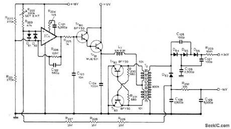 Circuit also provides 1-kV negative supply at 2 mA, as required for cathoderay tube of oscilloscope. Positive supply furnishes 50 μA at 3 kV. Design uses transistor inverter operating at about 20 kHz to simplify filtering. Tr82 and Tr83 form current-switched class D oscillator producing sine waves at high efficiency. Current multiplication is provided by Tr80 and Tr81 for 709 IC opamp.-C.M. Little,A 50 MHz Oscilloscope, Wireless World, July 1975,p 319-322. (View)