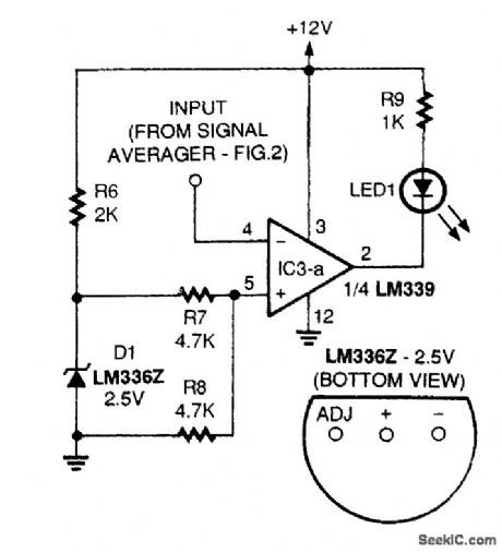 The voltage divider consisting of resistor R6 and 2.5-V precision voltage reference IC2 forms a precision voltage reference whose voltage is divided in half at the junction of resistors R7 and R8.This places a reference voltage of 1.25V at the comparator noninverting input. Whenever the inverting input voltage exceeds the reference voltage, the output will be connected to ground internally, and LED1 will light. With the input of this circuit connected to the output of the averager circuit, the LED will flash on whenever the audio input exceeds the level set with gain potentiometer R2. Adjust R2 by applying a maximum level signal to the input of the averager, and then reduce the level slightly to allow for headroom. With the input level now set, adjust R2 until the peak LED just turns on. (View)