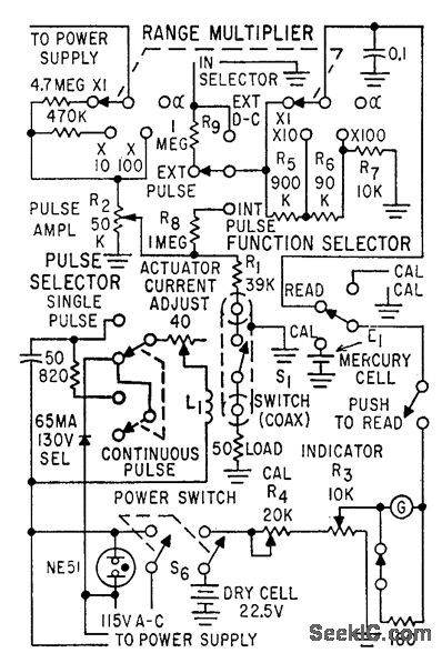 Uses coaxial discharge line to produce precise short pulses on keyed single-shot basis or of constant repetition rate. Works into 50-ohm load.-E. J. Martin, Jr., Calibrated Source of Millimicro second Pulses, Electronics, 32:16, p 56-57. (View)