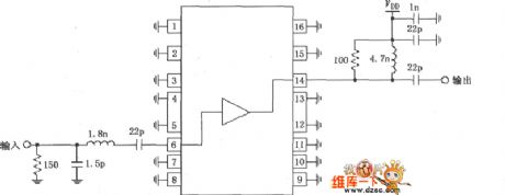 The picture shows 1930~1990MHz narrowband linear amplification circuit composed of RF2320. Radio-frequency signal (RF) is input by pin 6. Then it is output by pin 14 after passing amplifier. Pin 6 is direct coupled with internal amplifier. So it adds a blocking coupling capacitor. Normally, the gate voltage of input end is 0V. But the gate voltage will be enlarged when extent bias enlarges, and current will be increased at the same time. But it can not improve the linearity of amplifier. Pin 14 provides output and internal bias. There is no blocking coupling capacitor in the chip, but this pin has DC voltage. So it adopts 22pF capacitor to use as blocking capacitor. In order to get thelargest output power and efficiency, output matching network can make output impedance of amplifier match with it.