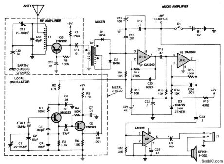 Incoming RF is picked by the antenna (ANTI) and is coupled via an autotransformer to a grounded-base amplifier (Q3) before being applied to a diode-mixer network that comprises T2, D1, and D2. The best mixer performance is obtained when both secondary windings of T2 are identical, and D1 and D2 are matched. The output of the local oscillator (LO)-a grounded-collector Colpitts oscillator (built around Q1)-is applied to emitter-follower/buffer Q2, which provides a low-impedance drive signal for the mixer. The demodulated signal is coupled to a pair of high-gain op-amp stages (U1-a and U1-b). The op amps provide a 50-dB gain. Amplifier U2 provides a 20-dB gain, thereby producing sufficient output drive for an 8-Ω speaker or 32-Ω headphones. The volume is controlled merely by adjusting the length of the whip antenna. When driving 32-Ω headphones, the circuit consumes less than 25 mA; however, the current drain increases to 40 mA when driving an 8-Ω speaker. (View)
