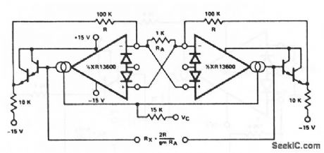 This circuit is similar to that of Fig. 11-6, except that both sections of the XR-13600 (Fig. 11-1B) are used. Each end of the resistor can be at any voltage within the output range of the XR- 13600. EXAR Corporation Databook 1990 p 5-254 (View)
