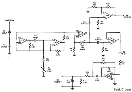 The figure shows the circuit diagram for an operational-amplifier VLF receiver. The circuit in the figure uses a virtual-inductor front end. A virtual inductor is a circuit that acts like an inductor, but isn't. Operational amplifiers AIA and AIB form a gyrator circuit. The inductance of this circuit is the product of the components shown between A1A and A1B [C3× 3300 × (R2 \+ R3)]. Capacitor C2 resonates with the virtual inductance produced by the gyrator circuit to tune the desired frequency. For the values of C2, CB, R2, and R3 shown, the circuit will tune from about 15 kHz to more than 30 kHz. Resistor R3 is the tuning control. It is a potentiometer, and should be either a multiturn knob via a vernier-reduction drive. The receiver front-end amplifier consists of amplifier A1C, which has a maximum gain of ×101 [i.e., (R7/R6)+1]. The output of A1C is an RF signal with a frequency equal to that tuned by the gyrator and C2. This signal is coupled to the RE output stage (A2A) through capacitor C5. The RF output stage shown here is a noninverting operational amplifier circuit with a gain of x2.The dc output circuit consists of a precise rectifier (A2B). The precise rectifier works like a regular rectifier, but does not have the low-voltage knee between 0 and 0.6 V (for silicon) or 0 and 0.2 V (for germanium). The pulsating dc from the precise rectifier is filtered and smoothed to straight dc, at a value proportional to the signal strength, by an RC integrator consisting of R12 and C7. The buffer amplifier (A1D) is used to isolate the precise rectifier from the RE output amplifier. (View)