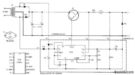 Uses MJ3000 Darlington power device as pass element providing gain of 1000 at 5 A. Output is set to current-limit at 6.5 A. Fuse at X is desirable. Values: R1 is 1.8 K; R2 is 2.5K trimpot; R3 is 2.7K; R4 is 1.5K; R5 is 0.1 ohm at 5 W; C1-C5 are 4000 μF each at 20 V; C6 is 250 μF at 25 V; C7-C8 are1.2 μF at 35 V; C9 is 220 pF; Dl-D2 are MR1120 or equivalent rated 6 A; D3-D4 are 1N4607 or equivalent; D5 is 1N4002 or equivalent; and T1 is 24-28 V CT secondary at 4 A. Article gives design procedure for increasing regulated output to as much as 100 A.-C. Anderton, A Hefty 12 Volt Supply, 73 Magazine. May 1975, p 85-87. (View)