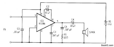 Single Radio Shack RS386 IC powered by 6-9 V from battery provides gain of about 200 with sufficient power to drive 8-ohm loudspeaker when speaking closely into small dynamic microphone of type used with portable tape recorders.-F. M. Mints, Integrated Circuit Projects, Vol. 2, Radio Shack, Fort Worth, TX, 1977, 2nd Ed., p 87-95. (View)