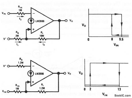 This circuit uses one section of an LM3900 connected to form a Schmitt trigger. Both inverting and noninverting versions are shown. By adjusting the values of RB, RF, and /RIN, the switching values of VIN can be set to any desired levels. National Semiconductor Linear Applications Handbook 1991 p 244 (View)