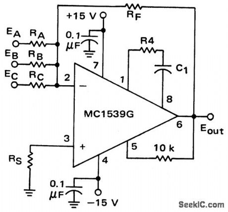 Summing amplifier using an MC1539 op amp (courtesy Motorola Semiconductor Products Inc.). (View)