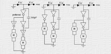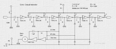 I'm not entirely happy with it, as it runs at 80 mA even when it's quiet (the 6-Nv ladder [some people call this a 'spinal cord'?] uses 34 mA by itself) and it makes some pretty raspy square-wave type beeps, but it DOES work. I am always happy when I design even more-or-less works! 8^D Don't ask me *how* it works, I'm not there yet. I did discover that the diodes (1N418 type) are needed to keep the sound oscillator from resetting the process in the spinal cord. I also found that I couldn't use the last Nv in the ladder to hook to a sound or it sent the ladder into a frenzy, don't know why though.