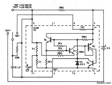 This low-cost 1-package siren has one VCO, and the other oscillator generates the voltage ramp to vary the frequency at the VCO output. All components within the dotted line are part of the IC. (View)