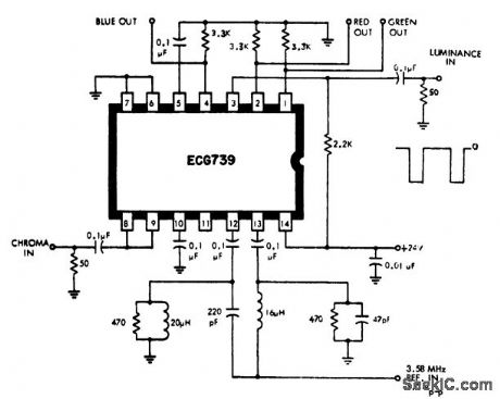 Color TV chroma demodulator with RGB output matrix. By applying a positive going blanking pulse to pin 6, blanking ofthe picture cluing line and frameflyback is achieved (courtesy GTE Sylvania Incorporated). (View)