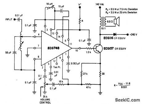 Complete TV sound system that provides approximately 2 watts ofaudio power.Sound detection is accomplished through a coincidence discriminatorin thechipthat requlres only one RLC phase shift network,supply for the chip should be approximately 16 volts,Selectthe value of resistor R toobtain 11.6 volts at pin 14 ofthe ECG748(courtesy GTE Sylvania Incorporated). (View)