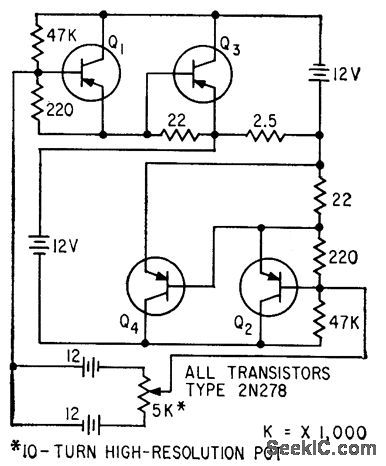 Diagonally symmetrical power transistor circuit permits smooth load current variation over range of several amperes at either polarity. Rectifier supply can be used in place of storage batteries. Maximum current drain from two 12-V dry cells in 5K potentiometer control circuit is 7 ma.-R. R.Bockemuehl, Transistor Rectifier Gives D-C of Either Polarity, Electronics, 32:25, p 76. (View)
