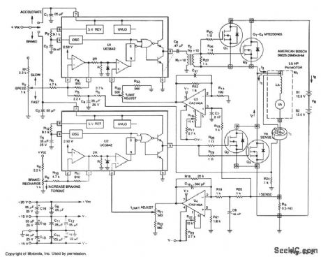 In the accelerate mode, Q1 through Q3 receive gate pulses from U1, an on-line, current-mode, PWM controller IC. Assuming negligible effects of R, when Q1 through Q3 turn on, current I1 builds up through the motor at a rate of: