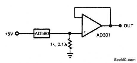 Use of factory-trimmed AD590 IC temperature sensor gives wide temperature range with minimum number of parts. Other temperature scales can be obtained by offsetting AD301 buffer opamp.-J. Williams, Designer's Guide to: Temperature Measurement, EDN Magazine, May 20, 1977, p 71-77. (View)