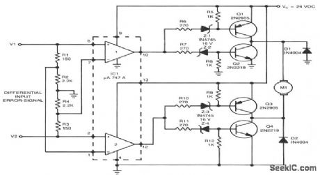 This high-performance switching controller for a low-power dc servo motor uses a symmetrical complementary-transistor bridge. The bridge acts as a reversing switch between the motor and a single-ended power supply. Since the transistors operate either fully on or completely off, except during a very short transition period, much less heat is dissipated than in linear-amplifier circuits. Damping is provided by the circuit's inherent dynamic braking. Since either maximum or zero voltage is applied to the motor, the dynamic response is faster than that of linear servo drives. (View)