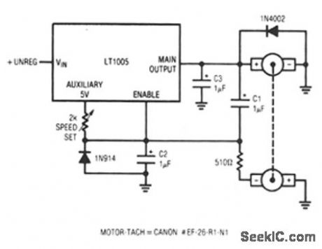 This circuit uses a tachometer to generate a feedback signal which is compared to a reference supplied by the auxiliary output. When power is applied, the tachometer output is zero and the regulator output comes on, forcing current into the motor. As motor rotation increases, the negative tachometer output pulls the enable pin toward ground. When the enable pin's threshold voltage is reached, the regulator output decreases and the motor slows. C1 provides positive feedback, ensuring clean transitions. In this fashion, the motor's speed is servo-controlled at a point determined by the 2-KΩ) potentiometer setting. The regulator free-runs at whatever frequency and duty cycle are required to maintain the enable pin at its threshold.The loop bandwidth and stability are set by C2 and C3. The 1N914 diode prevents the negative output tachometer from pulling the enable pin below ground, and the 1N4002 commutates the motor's negative flyback pulse. (View)