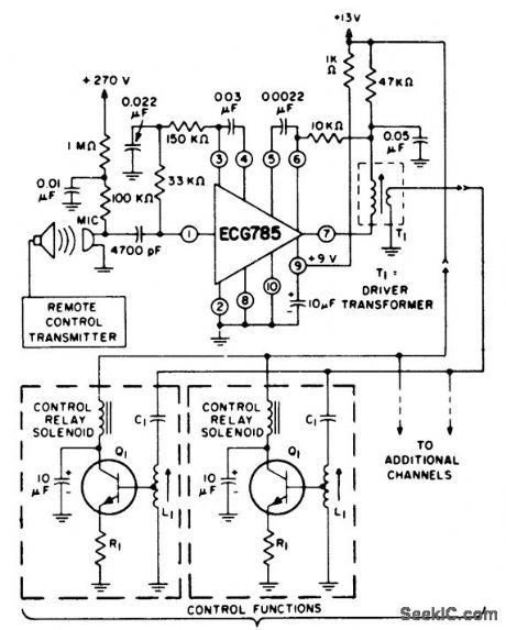Remote control receiver for TV. Use ECG103 As for the relay drivers. Select the coils and transformers for the desired frequency. The ECG785 has a voltage gain of 129 dB at 40 kHz with the three internal amplifiers in cascade (courtesy GTE Sylvania Incorporated). (View)