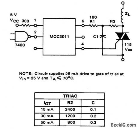Logic to inductive load interface using an MOC3011 optically coupled triac driver (courtesy Motorola Semiconductor Products Inc.). (View)