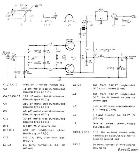 Single-stage design using two 2N6084 transistors combined with simple LC components can be tuned from 144 to 175 MHz. Typical input is 20W for 80-W output at 144 MHz. Article shows how to add 2N6083 driver stage that reduces input drive require-ment to 2,5 W. Power gain at 144 MHz is 6 dB. Article covers construction and adjustment.—J. Hatchett, A Solid 80 Watts fol Two Meters, Ham Radio, Dec. 1973, p 6-12. (View)