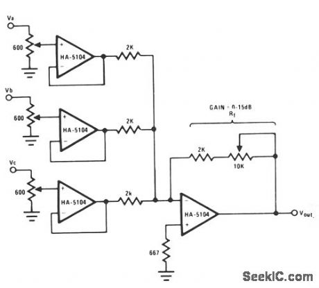 A high signal-to-noise ratio is important in stgnal construction and combination. The HA-5147 aids in lowering overall system noise and thereby raises system sensitivity. The signal combination circuit incorporates input buffering with several other features to form a relatively efficient mixer stage with a minimum of channel crosstalk. The potentiometer used for each channel allows for both variable input levels and a constant impedance for the driving source. The buffers serve mainly to prevent reverse crosstalk back through the resistor network. This buffering allows for the combination of varying strength signals without reverse contamination. The gain of the final stage is set at a minimum of 10 and can be adjusted to as much as 20.This allows a great amount of flexibility when combining a vast array of input signals. (View)