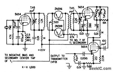 Used with double-side-band suppressed-carrier modulation. Crystal-controlled Colpitts oscillator drives transistor gate, which in turn feeds conventional tuned pentode r-f amplifier and tuned cathode follower.-J. Dysinger, W. Wyland, and It Wood, New Suppressed-Carrier Modulation Technique, Electronics, 33:6, p 47-49. (View)
