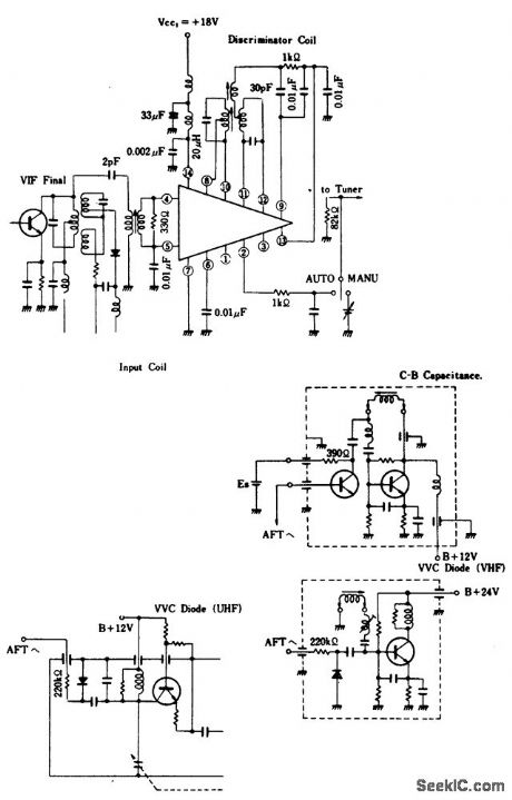 TV AFT/AFC circuit for three types of systems using an ECG1046 14-pin DIP. The ECG1046 contains two VIF differential amplifiers, a phase detector, and a DC amplifier, whose output is supplied to a varactor diode in a tuner. It has the additional feature of having an internal regulated voltage supply. Partial tuner circuits shown are only for example applications. Coils and transformers should be selected to match the IF and can be obtained from discarded TV receivers or purchased at a local electronics parts jobber (Merit or Miller components). Maximum supply voltage for the ECG1046 is 20 volts (courtesy GTE Sylvania Incorporated). (View)