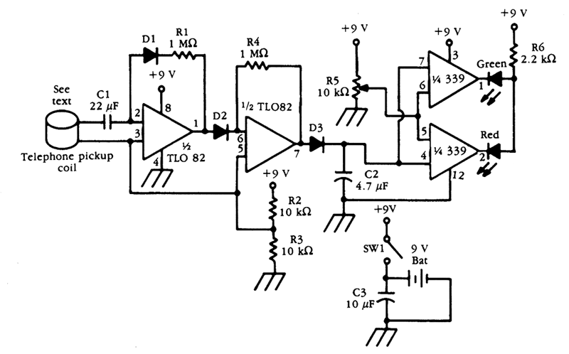A telephone pick-up coil is used as a sensor for low-frequency magnetic fields. The signal is amplified and detected, then used to drive a comparator.