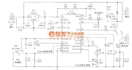 The heart of the motion detector movement detection circuit is motion detection chip IC1 (KC778B). The signal frequency from PIR sensor is low (0.1Hz ~ 10Hz) while the band is very wide, the chip will optimize it. The working voltage of KC778B is 4V ~ 15V, 78L05 requires 9V ~ 12V input voltage. The circuit has three sensitivity controllers. You can see a brief description in the figure. The detection sensitivity is cotrolled by the semi-variable resistor P1 connecting on chip 2 feet. When the level of the pin is connected to the sensor, thepotential is equal to the potential on pin 7(about 0.5V),and thesensitivity is the lowest. When pin 2 is grounded (about 0.125V), system sensitivity is the maximum. Sun sensitivity is controlled by semi-variable resistor and P2 photodiode LDR. Generally we hope that this detector does not work in the daytime, but only work at night, and itmay be connected to the lighting line. If you do not need this feature, you can connect Vcc pin on 12 feet and 11 feet will be vacant. P3 is adjusted by the timing pulse, the output pulse width in the range is more than 1.5s.