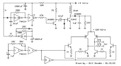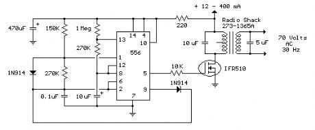 The circuit below is a DC to DC converter using a standard 12 VAC center tapped power transformer wired as a blocking oscillator. The circuit is not very efficient but will produce a high voltage usable for low power applications. The input battery voltage is raised by a factor of 10 across the transformer and further raised by a voltage tripler consisting of three capacitors and diodes connected to the high voltage side of the transformer. The circuit draws about 40 milliamps and should operate for about 200 hours on a couple of 'D' alkaline batteries. Higher voltages can be obtained by reducing the 4.7K bias resistor. (View)