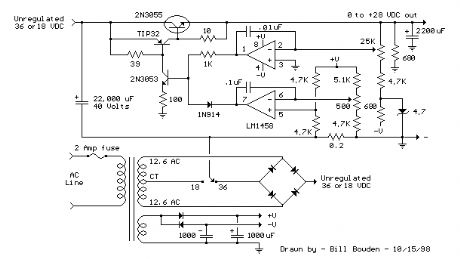 This regulated power supply can be adjusted from 3 to 25 volts and is current limited to 2 amps as shown, but may be increased to 3 amps or more by selecting a smaller current sense resistor (0.3 ohm). The 2N3055 and 2N3053 transistors should be mounted on suitable heat sinks and the current sense resistor should be rated at 3 watts or more. Voltage regulation is controlled by 1/2 of a 1558 or 1458 op-amp. The 1458 may be substituted in the circuit below, but it is recommended the supply voltage to pin 8 be limited to 30 VDC, which can be accomplished by adding a 6.2 volt zener or 5.1 K resistor in series with pin 8. The maximum DC supply voltage for the 1458 and 1558 is 36 and 44 respectively. The power transformer should be capable of the desired current while maintaining an input voltage at least 4 volts higher than the desired output, but not exceeding the maximum supply voltage of the op-amp under minimal load conditions. The power transformer shown is a center tapped 25.2 volt AC / 2 amp unit that will provide regulated outputs of 24 volts at 0.7 amps, 15 volts at 2 amps, or 6 volts at 3 amps. The 3 amp output is obtained using the center tap of the transformer with the switch in the 18 volt position. All components should be available at Radio Shack with the exception of the 1558 op-amp.