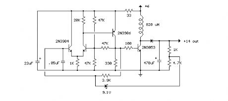 In this small switching power supply, a Schmitt trigger oscillator is used to drive a switching transistor that supplies current to a small inductor. Energy is stored in the inductor while the transistor is on, and released into the load circuit when the transistor switches off. The output voltage is dependent on the load resistance and is limited by a zener diode that stops the oscillator when the voltage reaches about 14 volts. Higher or lower voltages can be obtained by adjusting the voltage divider that feeds the zener diode. The efficiency is about 80% using a high Q inductor. (View)