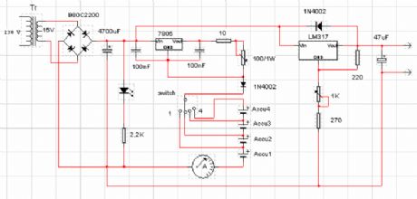 This circuit consists of two parts, charger and adapter. The transformer, rectifier bridge and buffer condensator are common. Adapter is quite simply its main part is an adjustable voltage regulator LM 317 according to usual setting. Output is a suitable for camera jack plug. Voltage can be adjusted in range 2-9 V.In the charger circuit a 7805 fixed voltage regulator works as current generator assured constant current during charging. This charging current can be adjusted with the 100 /1W potentiometer in range about 50-300 mA indicated by a small current measuring instrument. From one to four batteries can be charged simultaneously. The switch must be set according to number of batteries, and charging current of batteries given by manufacturer must be adjusted. This circuit doesn't measure charging time and charging condition of batteries. Manufacturers give charging time, usually 14-16 h. I solved this problem with a simply, cheap mechanical mains timer. I think its accuracy is sufficient. (View)