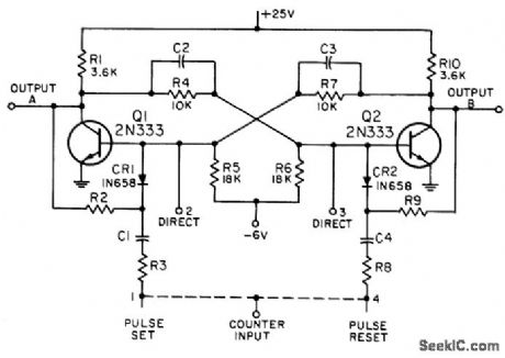 Slow-speed mvbr may be used as counter, shift register, gate, or switch. Provides transitional stages between electromechanical readout and higher-speed nonsaturating bistable counters. Maximum prf is 40 kc, delay time is 2 to 5 microsec, and output levels are both 18 V. 2N333 has been dropped from Preferred List, but 2N335 can be used if operating point is adjusted for its higher beta. -NBS, Handbook Preferred Circuits Navy Aeronautical Electronic Equipment, Vol. II, Semiconductor Device Circuits, PSC 14 (originally PC 250), p 14-2. (View)