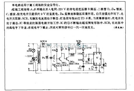 In construction site, A, B terminals are connected to power network, 220V mains supply is reduced by transformer B, it is rectified by Dw and filtered by C1, it provides photoelectric switch with 9V DC power. Dw takes the action of rectification and voltage regulation. Under bright light during the day, photoelectric switch cuts off, SCR1 has no trigger current and it is in off state, the red singal indicator light ZD does not turn on. When night comes, photoelectric switch turns on, the oscillation circuit which is composed of IC starts to work, IC's ③ constantly outputs ultra-low frequency rectangular pulse, SCR2 is conduction under this pulse's high level, and it is closed under the low level, so we can see the singal light winking. (View)