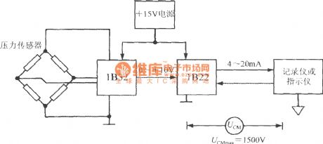 The output signal of pressure sensor 1B32 firstly converted into 0 ~ +10 V voltage signal by bridge sensor signal conditioner, then the 1B22 converts it into 4 ~ 20mA current signal which is finally sent to recorder or indicator. The highest insulation voltage = 1500V ( RMS) UCMmax between public ground of secondary instrument and the power ground of 1B22.