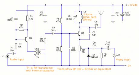 Notes: Assemble the circuit on a good quality PCB. Inductor L1 can be made by making 4 turns of 24SWG enameled copper wire on a 6mm dia: plastic former. T1 can be a radio frequency transformer with built in capacitor. (Can be found on old transistor radio boards). Antenna A1 can be a 1M long copper wire. (Experiment with the length to get optimum performance). This transmitter is working in VHF band somewhat between 50 � 210MHz. This transmitter is compatible only with PAL B and PAL G systems. (View)