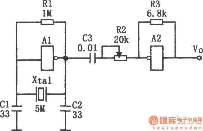 The sine wave generator composed of inverter is shown as the chart. The circuit could get high stable sine wave in more than a few MHz. In the figure, A1 and the crystal oscillator form a oscillating circuit, the output of A1 becomes sine wave signal after passing the buffer A2. In the circuit, A1 is linear amplifier, the whole circuit is in amplifying state. As the characteristics of the crystal oscillator are different, the output frequency and voltage are different, and R2 is used to adjust waveform. For getting ccurate oscillation frequency, it can connect a variable capacitor on two ports of capacitor C1 in parallel. Oscillation frequency of the circuit is decided by crystal oscillator, it can change the output signal frequency.