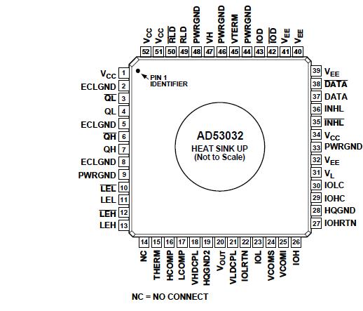 The active load of AD53032 can be set for up to 35 mA load current withless than a 10 mA linearity error through the entire set range.IOH, IOL and the buffered VCOM are independently adjustable.Onboard Schottky diodes provide high speed switching and lowcapacitance.