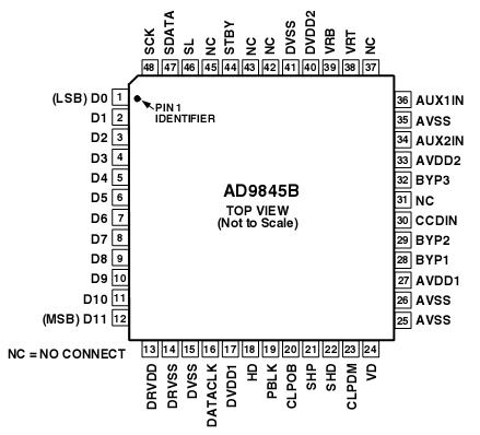 The AD9845B is an improved version of the AD9845A CCD signal processor. It features a 30 MHz single-channel architec-ture designed to sample and condition the outputs of interlaced and progressive scan area CCD arrays. The AD9845B's signal chain consists of an input clamp, a correlated double sampler (CDS), PxGA, a digitally controlled VGA, a black level clamp,and a 12-bit A/D converter. Additional input modes are also provided for processing analog video signals.