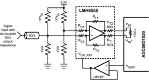 Each converter ADC08D1020 has a selectable output demultiplexer which feeds two LVDS buses. If the 1:2 demultiplexed mode is selected, the output data rate is reduced to half the input sample rate on each bus. When non-demultiplexed mode is selected, that output data rate on channels DI and DQ are at the same rate as the input sample clock. The two converters can be interleaved and used as a single 2 GSPS ADC.