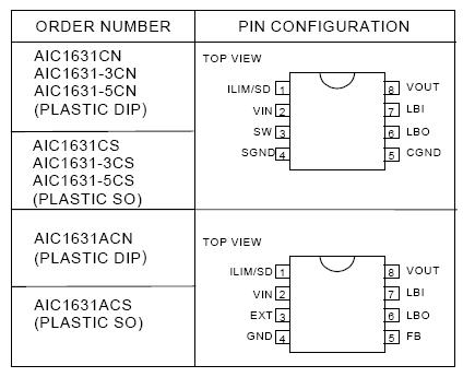 AIC1631: Features: High Efficiency 90%. Adjustable Output Voltage with Two Resistors(AIC1631A) Power-Saving Shutdown Mode (7A typical). Internal 2A Switch. 120KHz Switching Rate. Adjustable Switch Current L...