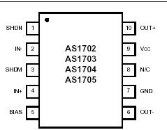 The AS1702, AS1703, AS1704, and AS1705 are pin compatible with the LM4895 and the MAX9718A/B/C/D. The devices are available in a 10-pin MSOP package.